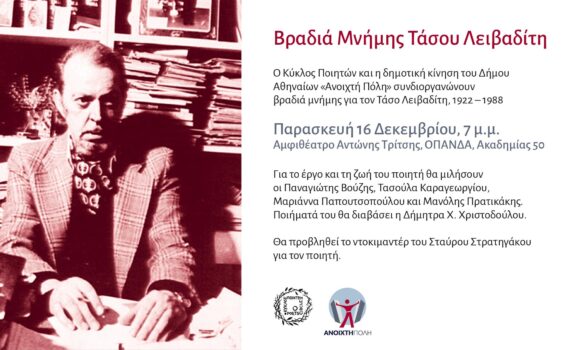 Τάσος Λειβαδίτης, 1922 – 1988Ο Κύκλος Ποιητών και η δημοτική κίνηση Ανοιχτή Πόλη, τιμούν τα 100 χρόνια από τη γέννηση του Τάσου Λειβαδίτη, ενός ποιητή με μεγάλο έργο, στις 16 Δεκεμβρίου στο κέντρο της Αθήνας. Προβολή ντοκιμαντέρ, τραγούδια, ομιλίες, απαγγελίες. Μια βραδιά που θα μας μείνει αξέχαστη. Ἀλλὰ τὰ βράδια […]