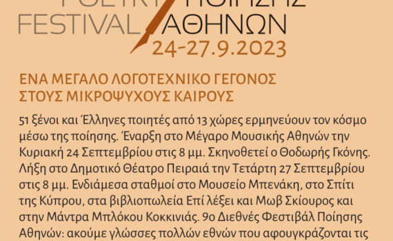 Φέτος είναι η δέκατη χρονιά του Διεθνούς Φεστιβάλ Ποίησης Αθηνών του Κύκλου Ποιητών. Από τις 23 έως τις 26 Σεπτεμβρίου 2024, θα φιλοξενήσει πενήντα έναν ποιητές από δώδεκα χώρες (Αλβανία, Ελλάδα, ΗΠΑ, Ιταλία, Κούβα, Κύπρος, Νιγηρία, Ολλανδία, Ουκρανία, Παλαιστίνη, Πολωνία, Πορτογαλία) σε εννέα χώρους διαφορετικού χαρακτήρα (Μέγαρο Μουσικής Αθηνών, Σπίτι […]