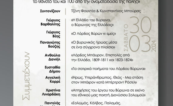 Ο Δήμος Βύρωνα εορτάζει τον Μάρτιο Μήνα Ποίησης συνδιοργανώνοντας με τον Κύκλο Ποιητών την ημερίδα «Λόρδος Βύρων, Στο πλευρό των Ελλήνων – 200 χρόνια από το θάνατό του και 100 από την ονοματοδοσία της πόλης» Ο Δήμος Βύρωνα εορτάζει τον Μάρτιο Μήνα Ποίησης συνδιοργανώνοντας με τον Κύκλο Ποιητών την ημερίδα […]